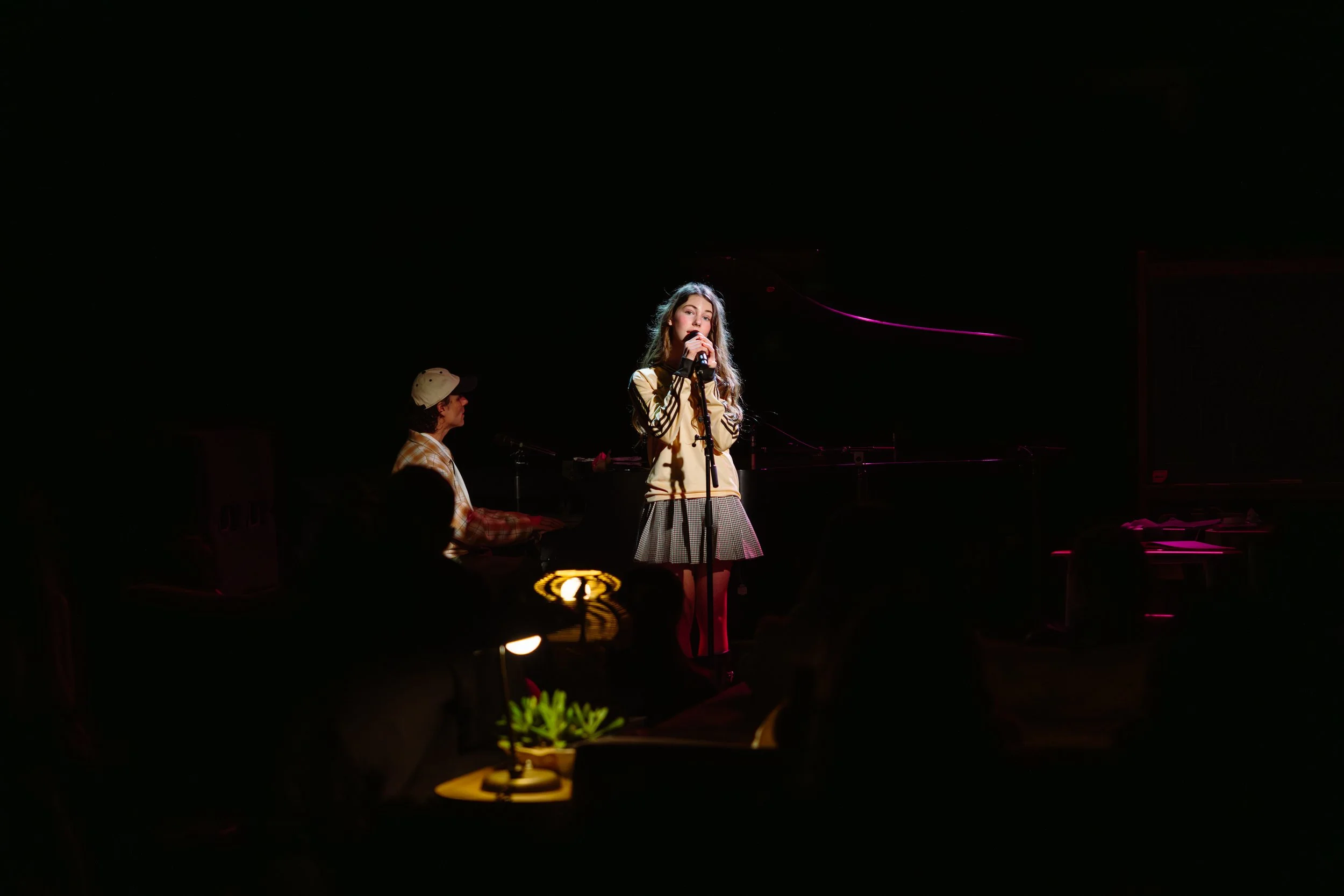 Her stage setup was filled with props you would find on a middle school campus, from double-tiered lockers to a cluster of desks in front of a scribbled chalkboard. Copperman headed straight towards the piano for “Struggle Bus” to kick off the showcase, donning a yellow rain jacket she wore in the track’s music video. “I’m the perfect definition / Of a walking contradiction / In and out of my mind / I do it all in record time,” she crooned into the mic. The singer occupied the stage like a seasoned artist, her vocals steady and effortless. “Struggle Bus is about all of the different versions of yourself that you may encounter throughout life,” she wrote in an Instagram post about the song. “ I have really learned to love and appreciate each and every one of them.”